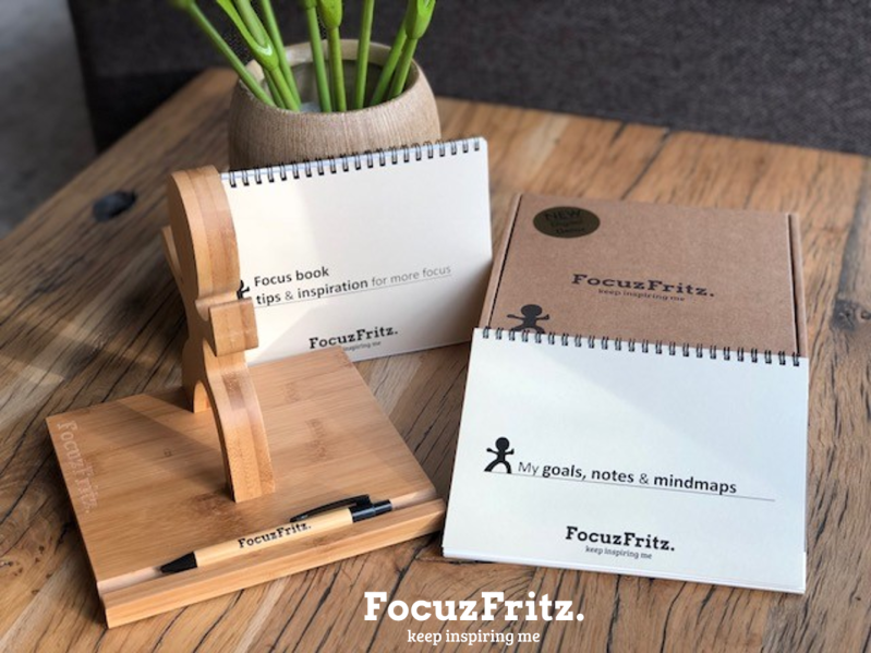FocuzFritz. wordt geleverd in een mooie, milieuvriendelijke geschenkverpakking. Inbegrepen zijn de FocuzFritz. design standaard, het Focus Book met praktische tips en inspiratie, het Notebook voor al jouw doelen en notities en een handige pen.